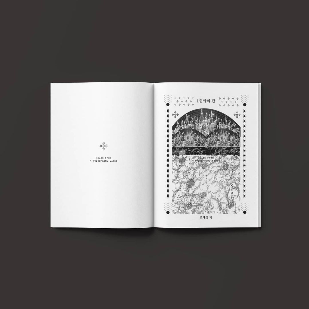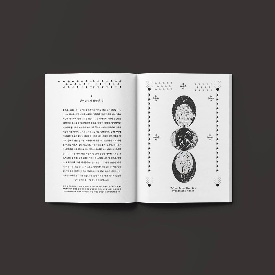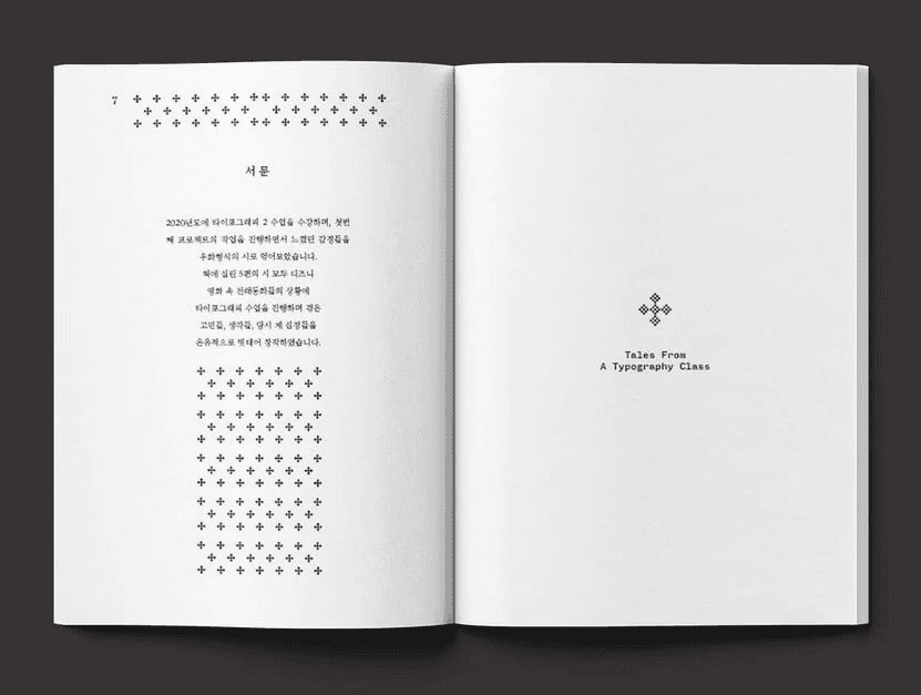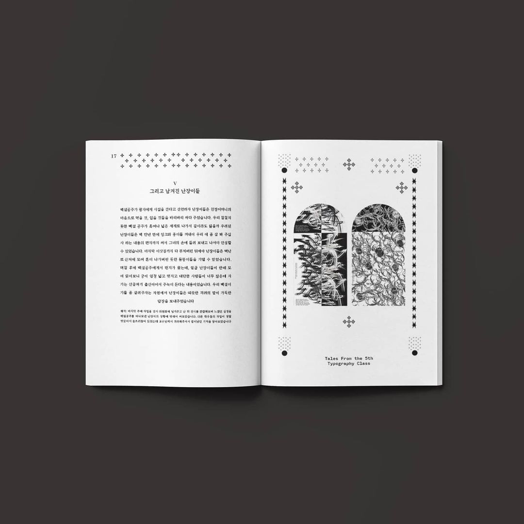 Several page spread variations were developed and refined to match the tone and pacing of the text. The contents page features ornamental type decorations reminiscent of vintage fairytale books, while graphic elements derived from course posters were reworked into symmetrical, decorative compositions that align with the classical layout system. The result is a book that merges historical design sensibilities with a contemporary and reflective narrative about learning and creativity.